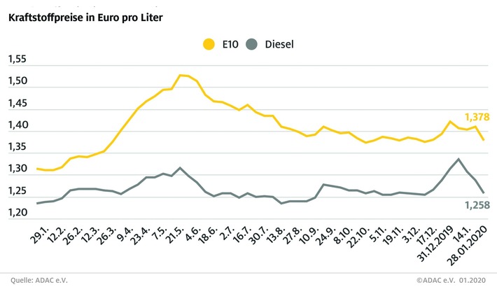 ADAC kostet ein Liter Super E10 im Bundesdurchschnitt 1,378 Euro, das sind 3,2