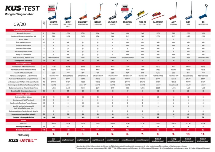 Mit teilweise deutlichen Unterschieden bei Qualität, Preis und Leistung aber dennoch „empfehlenswert“ sind die Rangierwagenheber von Güde (176 EUR), Unicraft (180 EUR), Bahco (245 EUR), KS-Tools (195 EUR), Michelin (68 EUR) und Dunlop (63 EUR). Im Test lediglich „bedingt empfehlenswert“ die Produkte von Cartrend (22 EUR), AWZ (119 EUR), BGS (177 EUR) und dem recht teuren „Schlusslicht“ AC (219 EUR).