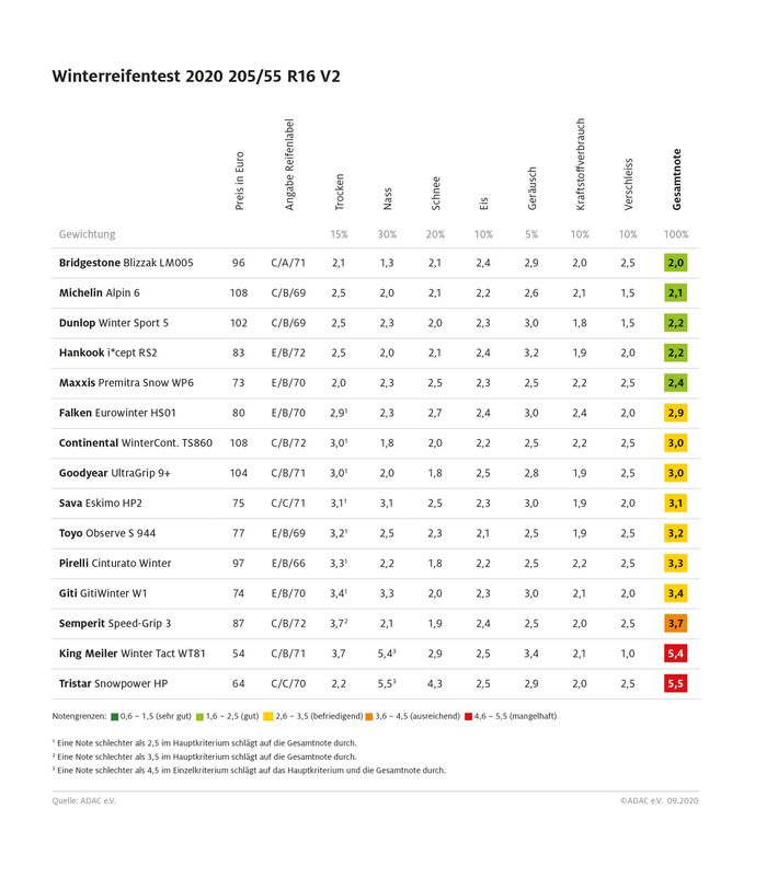 Winterreifen: Ausgewogen und empfehlenswert Reifen für untere Mittelklasse, SUV und Vans im ADAC Test