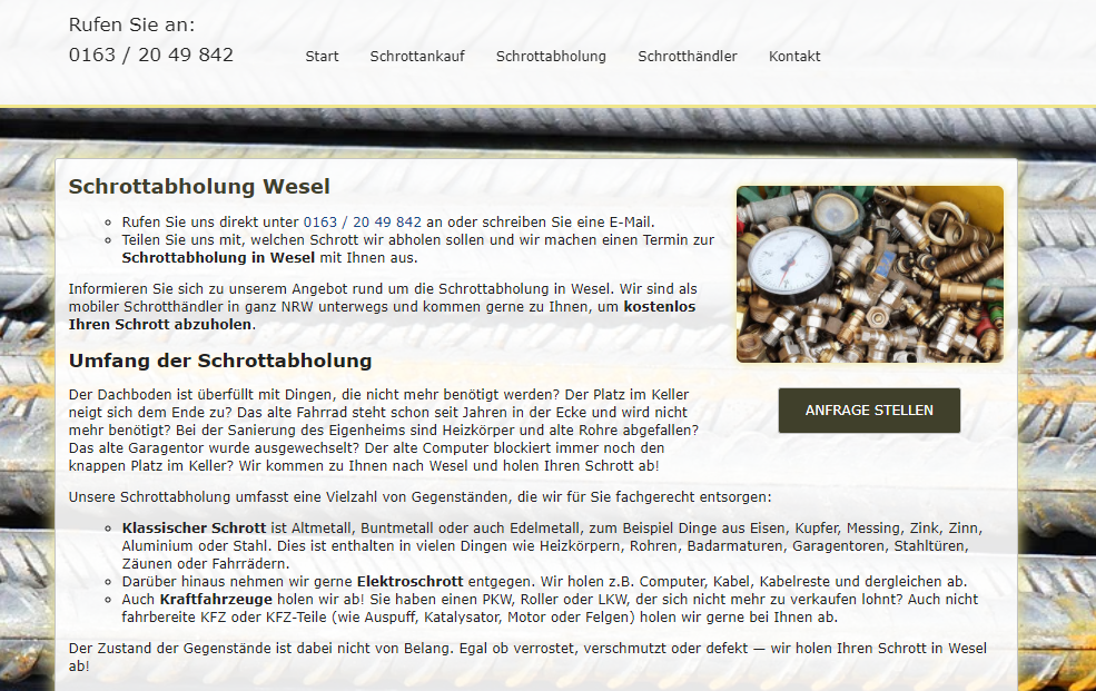 Die Schrottabholung Wesel kauft Schrott aller Art bei seinen privaten und gewerblichen Kunden in Wesel und dem gesamten Ruhrgebiet an. Er ist in der Lage, den Unternehmen die entsprechenden Nachweise zur Verfügung zu stellen und kümmert sich im Nachgang an den Schrott-Ankauf beziehungsweise die Schrottabholung um die fachgerechte Sortierung und Verbringung zu den Wiederaufbereitungsanlagen.