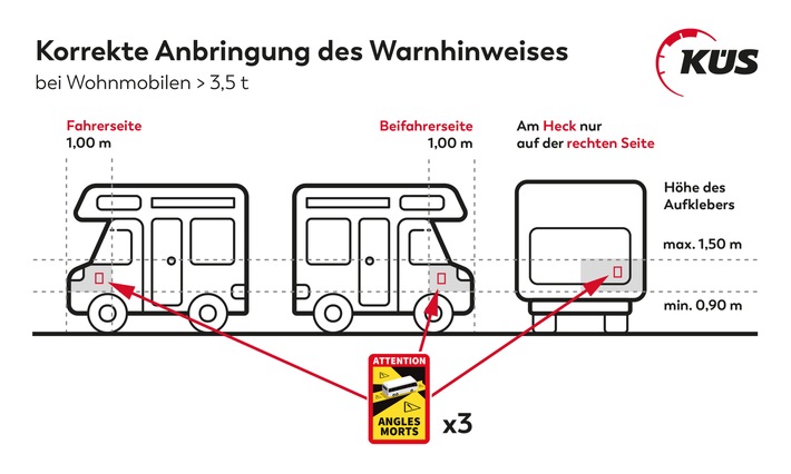 Losheim am See (ots) – Ein Warnaufkleber für Fahrzeuge mit Hinweis auf die Gefahren des toten Winkels, vor allem für Zweiradfahrer, ist ab diesem Jahr Pflicht in Frankreich. Die Bestimmung gilt für Fahrzeuge über 3,5 Tonnen. Damit fallen auch Wohnmobile und Caravans unter die Vorschrift. Klar bestimmt ist auch der Ort der Anbringung des Hinweises am Fahrzeug.