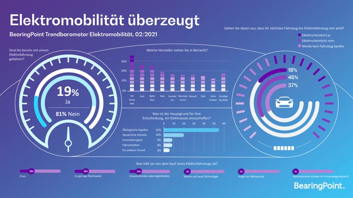 Die rein batteriebetriebenen Elektrofahrzeuge (BEV) liegen mit 42 Prozent bei den potenziellen E-Auto-Käufern in der Gunst fast gleichauf mit den Plugin-Hybriden (PHEV) mit 44 Prozent. Unter denjenigen, die sich ein Elektrofahrzeug anschaffen wollen, nennt eine Mehrheit von 55 Prozent ökologische Aspekte als Hauptgrund. Steuerliche Gründe sind nur für 20 Prozent entscheidend. Weitere Gründe sind Innovation und Fahrgefühl mit jeweils 8 Prozent.