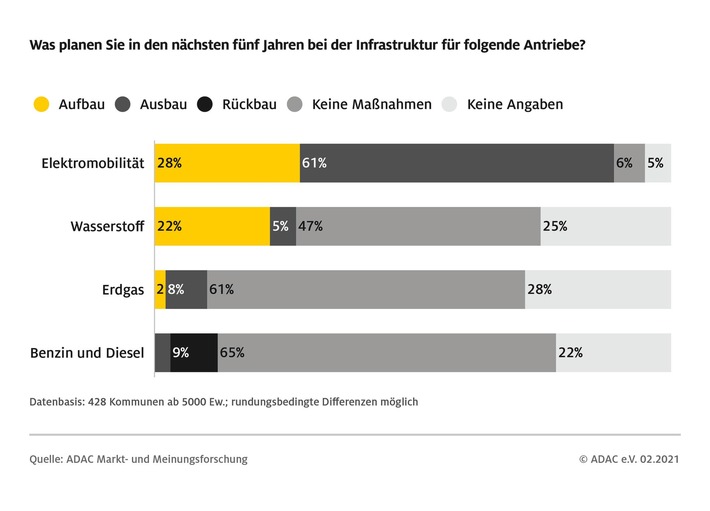 In den nächsten fünf Jahren wollen 28 Prozent der Städte und Gemeinden die Infrastruktur für E-Mobilität auf- und 61 Prozent ausbauen. Den Aufbau einer Wasserstoffinfrastruktur planen bereits 22 Prozent der Orte. Zum Vergleich: Nur jede fünfzigste Kommune setzt auf Erdgas. Jede Elfte rechnet mit Rückbau des Infrastrukturangebots für Benzin und Diesel.