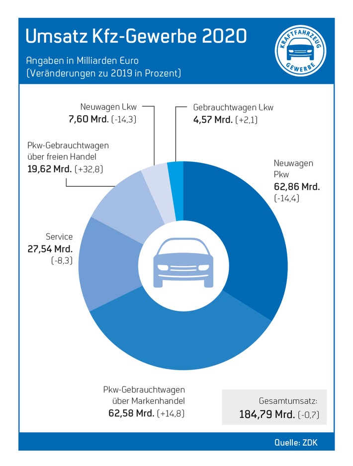 Aufgrund dieser unterschiedlichen Entwicklungen in den drei Geschäftsfeldern ging der Gesamtumsatz im Kfz-Gewerbe im Jahr 2020 um -0,7 Prozent auf rund 184,8 Mrd. Euro zurück. Die vorläufige durchschnittliche Rendite der Betriebe sank auf 1,2 Prozent und lag damit um 0,1 Prozentpunkt unter dem schon niedrigen Vorjahresniveau.