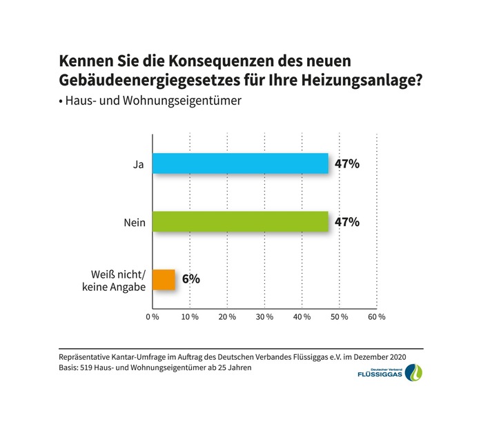 Viele Haus- und Wohnungseigentümer in Deutschland sind mit den neuen Regularien nicht vertraut: Nur knapp die Hälfte der Haus- und Wohnungseigentümer in Deutschland (47 Prozent) ist nach eigener Einschätzung gut über das Gebäudeenergiegesetz informiert und kennt die Konsequenzen für die eigene Heizungsanlage. Zu diesem Ergebnis kommt eine aktuelle Kantar-Umfrage im Auftrag des Deutschen Verbandes Flüssiggas e. V. (DVFG) (1).