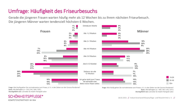 Frankfurt (ots) – Die Ergebnisse der aktuellen IKW-Umfrage zeigen, in welchen Abständen Frauen und Männer – normalerweise – zum Friseur gehen. Besonders eine Gruppe wird es kaum erwarten können, dass die Salons wieder aufmachen.