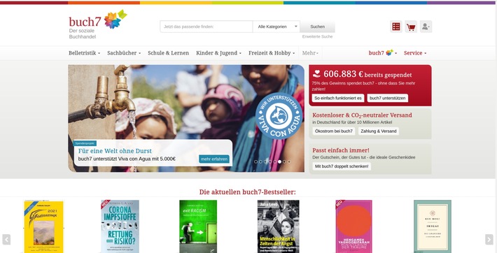 Seit 2007 ist buch7 die gemeinnützige Alternative zu Amazon, denn mit 75 Prozent des Gewinns fördert buch7 soziale, kulturelle und ökologische Projekte. Dies entsprach bisher ca. 5 Prozent des Umsatzes. So konnten insgesamt schon über 600.000 EUR gespendet werden. In den Lockdown-Monaten suchen die Menschen Lesestoff und bestellen bei buch7 in Rekordmengen. Das Positive daran: Die Bestellungen haben auch Rekordspenden zur Folge. Denn von den Mehraufträgen profitieren unmittelbar gesellschaftlich wertvolle Projekte.