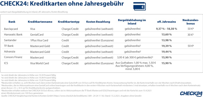 München (ots) – Viele Banken bitten Besitzer*innen von Kreditkarten verstärkt zur Kasse. Das kostet sie bis zu 99 Euro Gebühr pro Jahr.1) Allerdings bieten einige Institute kostenlose Kreditkarten an – ein zusätzlicher Abschluss eines Girokontos ist bei diesen Instituten nicht notwendig. Zwei von ihnen verzichten sogar auf weitere Zusatzgebühren wie beispielsweise für das Bezahlen in fremder Währung oder das Geldabheben. Bei drei Karten profitieren Neukund*innen zusätzlich von einem Bonus.