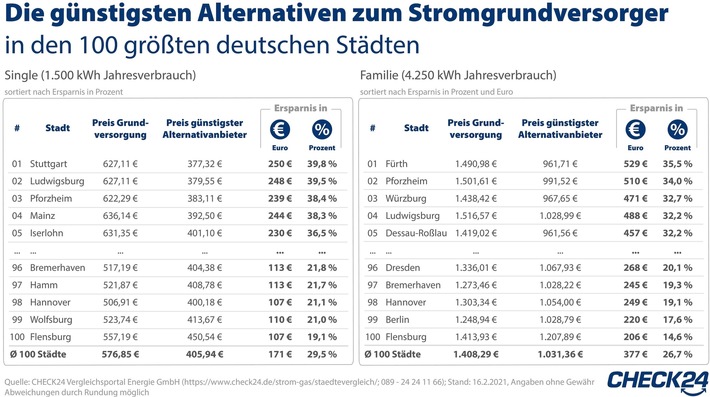 München (ots) – Verbraucher*innen zahlen Rekordpreise für Strom (https://www.check24.de/strom/stromkosten/). Gegen eine zu hohe Stromrechnung hilft ein Anbieterwechsel. Ein Single (1.500 kWh) in Stuttgart kann so seine Stromkosten um bis zu 40 Prozent senken. Das entspricht 250 Euro innerhalb eines Jahres. Im Durchschnitt der 100 größten deutschen Städte zahlen Einpersonenhaushalte beim günstigsten Alternativanbieter jährlich rund 30 Prozent bzw. 171 Euro weniger als in der Grundversorgung (https://www.check24.de/strom-gas/grundversorgung-ersatzversorgung/).1)