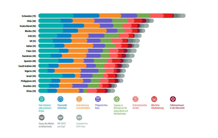Der Parenting Index zeigt, dass in Schweden, Chile und Deutschland dank guter Rahmenbedingungen Elternsein als relativ leicht wahrgenommen wird. Deutschland rangiert auf Platz 3 des Index. Die Schlüsselfaktoren, die im internationalen Vergleich für Eltern in Deutschland eine größere beziehungsweise eine geringere Rolle spielen, sind: