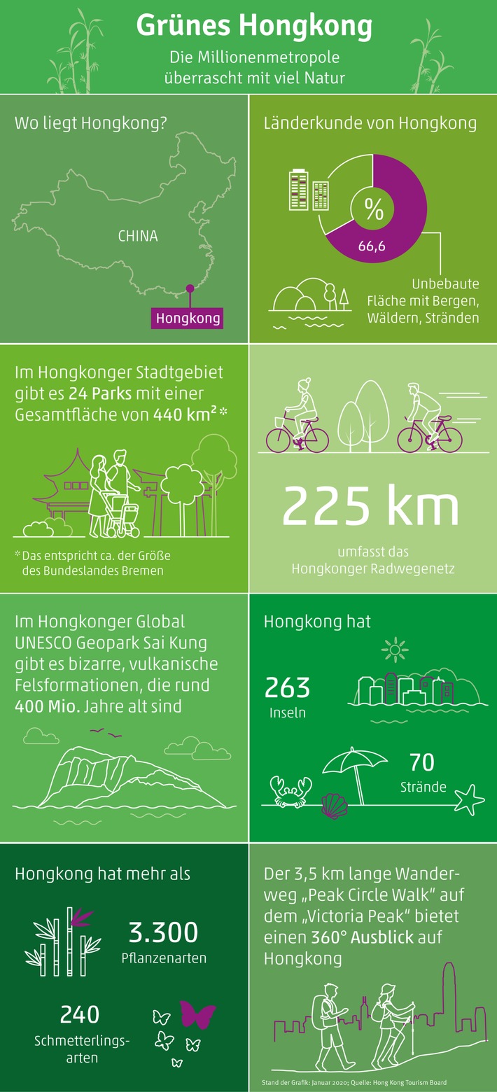 Hong Kong / Frankfurt (ots) – Hong Kong – Millionenmetropole, Finanzschauplatz und Großstadtdschungel – soweit die Assoziation. Doch dass Hongkong auch eine grüne Seite hat, überrascht selbst die Einheimischen immer wieder aufs Neue: Denn Hongkong besteht tatsächlich zu zwei Dritteln aus unbebauter Fläche – 40 Prozent davon stehen sogar unter Naturschutz. Rund 240 Inseln gehören zu der Sonderverwaltungszone, viele davon unbewohnt. Am besten entdecken lässt sich das grüne Hongkong auf den unzähligen Wander- und Radrouten.