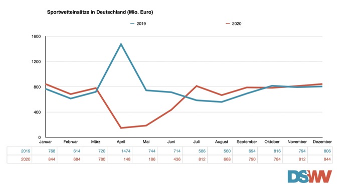 Berlin (ots) – Der Sportwettenmarkt in Deutschland ist im Coronajahr 2020 stark eingebrochen. Dies geht aus den Sportwettsteuerzahlen des Bundesfinanzministeriums hervor. Die Gesamtumsätze lagen bei 7,8 Mrd. Euro und damit rund 16 Prozent unter dem Rekordwert des Jahres 2019 (9,3 Mrd. Euro) – das entspricht abgeführten Sportwettsteuern in Höhe von 389 Mio. Euro (2019: 464 Mio. Euro). Ohne Berücksichtigung der Vorkrisenmonate Januar und Februar fällt der Einbruch noch deutlicher aus (- 20 %). Als Gründe für die Umsatzrückgänge nannte der Deutsche Sportwettenverband (DSWV) auf seiner heutigen Jahres-Pressekonferenz ausgefallene Sportereignisse sowie Wettbüroschließungen im Lockdown.