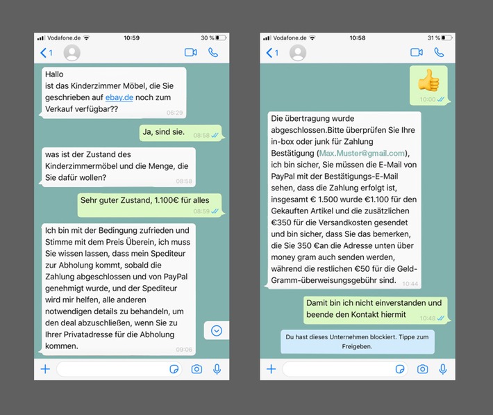 – Grundsätzlich sollten Kleinanzeigen-Verkäufer bei Nachrichten vorsichtig sein, die nach automatischer Übersetzung klingen. Im Zweifelsfall sollten sie Textbausteine in eine Suchmaschine eingeben. Oft werden betrügerische Nachrichten wortgleich immer wieder verwendet – und es sind bereits andere darauf hereingefallen.