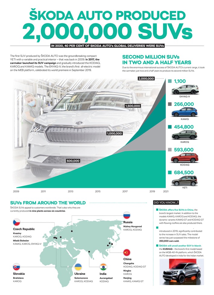In Tschechien produziert ŠKODA AUTO seine SUV-Modelle an den Standorten Mladá Boleslav und Kvasiny. Am Stammsitz des Unternehmens in Mladá Boleslav entstehen neben dem ŠKODA KAMIQ auch der ŠKODA ENYAQ iV und der ŠKODA KAROQ. Dieses Modell fertigt ŠKODA zusätzlich im Werk Kvasiny, hier rollt außerdem der ŠKODA KODIAQ vom Band. Außerhalb seines Heimatlandes Tschechien baut der Automobilhersteller seine SUV-Modelle in China, Russland und Indien sowie in der Ukraine und der Slowakei. Auf seinem weltweit größten Einzelmarkt China bietet ŠKODA mit dem KAMIQ GT und dem KODIAQ GT zusätzlich spezifische Derivate an. Damit ist China der einzige Markt, auf dem das aktuelle ŠKODA Modellportfolio insgesamt fünf SUV-Modelle umfasst. In Indien feiert ŠKODA noch diesen Monat die Weltpremiere des ŠKODA KUSHAQ. Er ist das erste Serienmodell des Herstellers, das auf der von ŠKODA AUTO speziell für den dortigen Markt angepassten MQB-A0-IN-Version des Modularen Querbaukastens basiert. Als erstes von mehreren Kompaktmodellen im Rahmen des Projekts INDIA 2.0 markiert der ŠKODA KUSHAQ für das Unternehmen in Indien den Aufbruch in eine neue Ära. Die Weltpremiere des neuen ŠKODA KUSHAQ findet am 18. März 2021 statt.