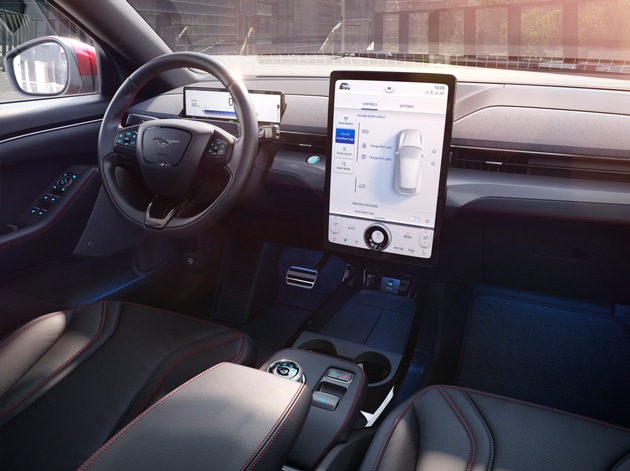 Wer in den neuen, batterie-elektrischen Ford Mustang Mach-E* einsteigt, erlebt ein eingeständiges Interieur. Bei der Gestaltung des Innenraums waren Kundenwünsche aufgegriffen und konsequent umgesetzt worden. Während der allgemeine Trend in den vergangenen Jahrzehnten eher zu einem Innenraum-Design mit vielen Knöpfen, Schaltern und zum Teil verspielten Design-Elemente ging, verfolgt Ford beim Mustang Mach-E einen Ansatz des „Weniger ist Mehr“. Zentrale Leitlinie dieses reduktiven Ansatzes: Der Mensch steht im Mittelpunkt eines aufgeräumten, klar strukturierten, ganzheitlichen Raumkonzepts. Das reduktive Design, also das mit den Mitteln der Reduzierung arbeitende Design, bettet alle Insassen in eine komfortable und zugleich aufgeräumte Umgebung ein. Im Falle des neuen Mustang Mach-E beinhaltet dies beispielsweise einen großen, senkrecht angeordneten Zentral-Touchscreen, über den sich fast alle Fahrzeug-Funktionen bedienen lassen – wie bei einem Tablet zum Beispiel per Wischbewegung.