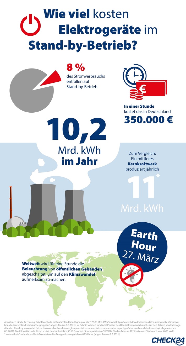 1) Annahmen für die Rechnung: Privathaushalte in Deutschland benötigen pro Jahr 126,88 Mrd. kWh Strom (https://ots.de/Td4e6b; abgerufen am 8.3.2021). Im Schnitt werden rund acht Prozent des Haushaltsstromverbrauchs auf den Betrieb von Elektrogeräten im Stand-by verwendet (https://ots.de/ZVSUBi; abgerufen am 8.3.2021). Die Kilowattstunde Strom kostet durchschnittlich 30,18 Eurocent (Strompreisindex CHECK24 für den Februar 2021 bei einem Verbrauch von 5.000 kWh). – https://ots.de/rXO05s