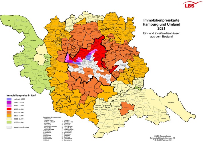 Auf der Grundlage wissenschaftlicher Analysen des Hamburger Instituts F+B Forschung und Beratung für Wohnen, Immobilien und Umwelt GmbH wurden 12.244 öffentlich zugängliche Immobilien-Angebote in Hamburg und Umland im zweiten Halbjahr 2020 ausgewertet. Die dargestellten Preise sind jeweils Mittelwerte der Marktpreise. Je nach Lage der Immobilien in den Regionen sind daher Abweichungen nach oben und unten möglich. Die LBS-Immobilienmarktatlanten „Regionen in Schleswig-Holstein“ und „Hamburg und Umland“, die regelmäßig aufgelegt werden, erhöhen die Markttransparenz bei den Immobilienpreisen.