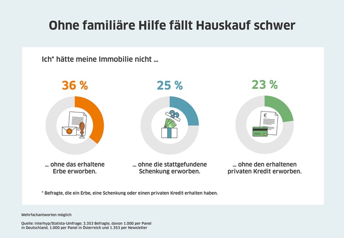 München (ots) – Trotz seit Jahren anhaltender Niedrigzinsen wird es für die Menschen immer schwerer, in privates Wohneigentum zu investieren. Ohne Erbschaft, Schenkung oder Privatkredit hätten viele heutige Eigentümer den Sprung in die eigenen vier Wände nicht geschafft. Das zeigt eine von Statista im Auftrag der Interhyp Gruppe in Deutschland und Österreich durchgeführte Erhebung unter insgesamt 3.353 Immobilienbesitzern. „Der Wohneigentumserwerb zählt zu den größten Wünschen. Gleichzeitig wird der Weg dahin als immer schwieriger empfunden. Besonders jungen Menschen fällt der Aufbau von Immobilienwerten ohne private Unterstützung schwer“, sagt Jörg Utecht, Vorstandsvorsitzender der Interhyp Gruppe, die mit einem in 2020 vermittelten Finanzierungsvolumen von 28,8 Milliarden Euro Deutschlands größter Vermittler für private Baufinanzierungen ist.