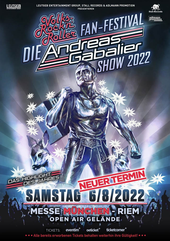 Auf Grund dieser Gegebenheiten haben wir uns schweren Herzens dazu entschlossen, dass für den 31. Juli 2021 geplante ANDREAS GABALIER Volks-Rock´n-Roller Fan-Festival auf dem Open-Air-Gelände der Messe München auf den Samstag, 06. August 2022 zu verlegen.
