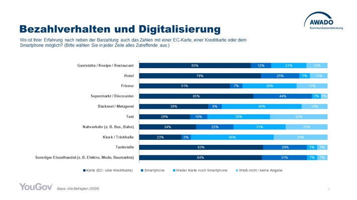 Frankfurt/Düsseldorf (ots) – Die Hälfte der Deutschen ab 18 Jahren würde laut einer repräsentativen YouGov-Umfrage* grundsätzlich häufiger mit Karte oder Smartphone bezahlen. Allerdings ist dies längst noch nicht überall möglich.
