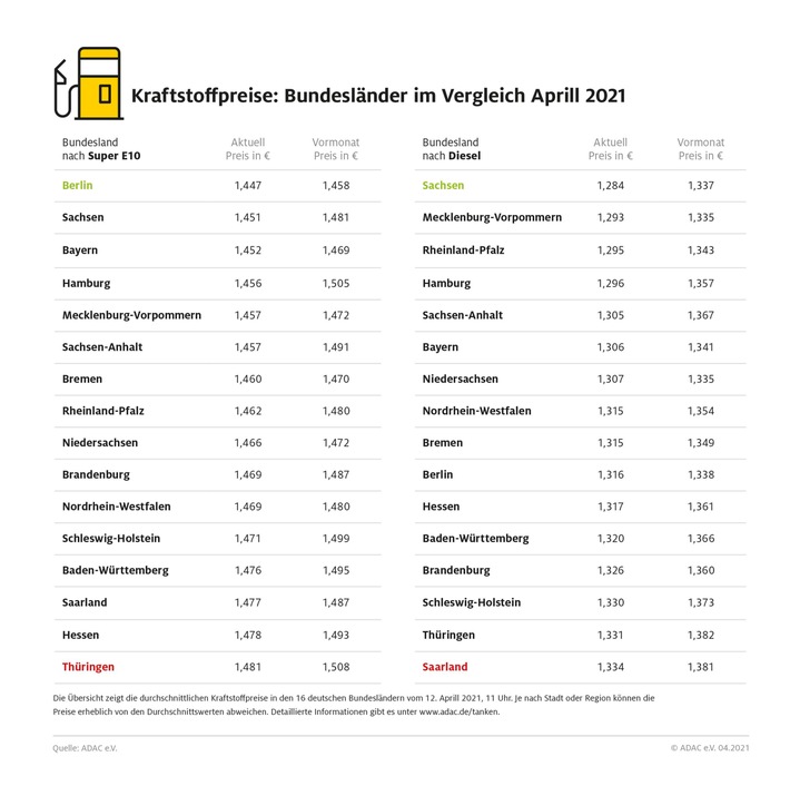 München (ots) – In keinen anderen Bundesländern ist Tanken derzeit so teuer wie im Saarland und in Thüringen. Das zeigt die aktuelle ADAC Auswertung der Kraftstoffpreise in den 16 Bundesländern. Danach kostet ein Liter Super E10 in Thüringen derzeit 1,481 Euro. Am günstigsten können die Fahrer von Benziner-Pkw momentan in Berlin tanken. Dort kostet ein Liter E10 1,447 Euro, das sind 3,4 Cent weniger als in Thüringen.