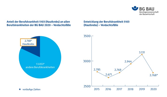 Berlin (ots) – Der durch natürliche Ultraviolettstrahlung (UV-Strahlung) verursachte weiße Hautkrebs war im Jahr 2020 die am häufigsten angezeigte Berufskrankheit in der Bauwirtschaft und im Bereich der baunahen Dienstleistungen. Rund 18 Prozent aller Meldungen entfielen auf dieses Krankheitsbild. So verzeichnete die Berufsgenossenschaft der Bauwirtschaft (BG BAU) im vergangenen Jahr mehr als 2.700 neue Fälle. Das zeigt eine vorläufige Auswertung für 2020, die die BG BAU heute im Rahmen einer Pressekonferenz vorgelegt hat. Demnach ging im Jahr 2020 fast jede fünfte gemeldete Berufskrankheit auf Hautkrebs zurück.