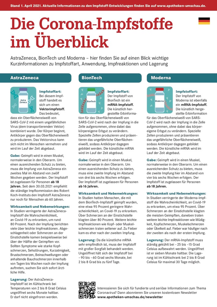 Der neue Flyer informiert übersichtlich und auch für Laien nachvollziehbar zu den wichtigsten Fragen rund um die drei Impfstoffe von AstraZeneca, BionTech und Moderna: