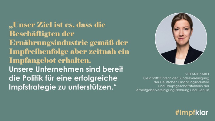 „Unsere Branche wünscht sich schnellstmögliche Impfangebote für alle Mitarbeitenden. Idealerweise können die Impfungen mit ausreichend Impfstoffverfügbarkeit dann vor Ort in den Unternehmen stattfinden und dadurch noch besser in die betrieblichen Abläufe integriert werden“, sagt Stefanie Sabet, Hauptgeschäftsführerin der Arbeitgebervereinigung Nahrung und Genuss (ANG).