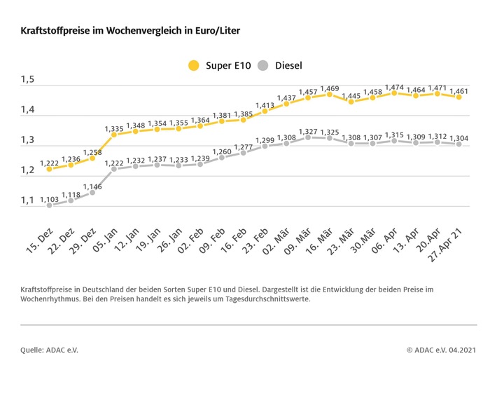 München (ots) – Autofahrer müssen derzeit etwas weniger an den Zapfsäulen bezahlen als noch vor einer Woche. Die vom ADAC ermittelten Durchschnittspreise notieren bei einem Liter Super E10 1,0 Cent, bei Diesel 0,8 Cent niedriger. Der Liter Super E10 kostet damit 1,461 Euro, Diesel 1,304 Euro im bundesweiten Schnitt.