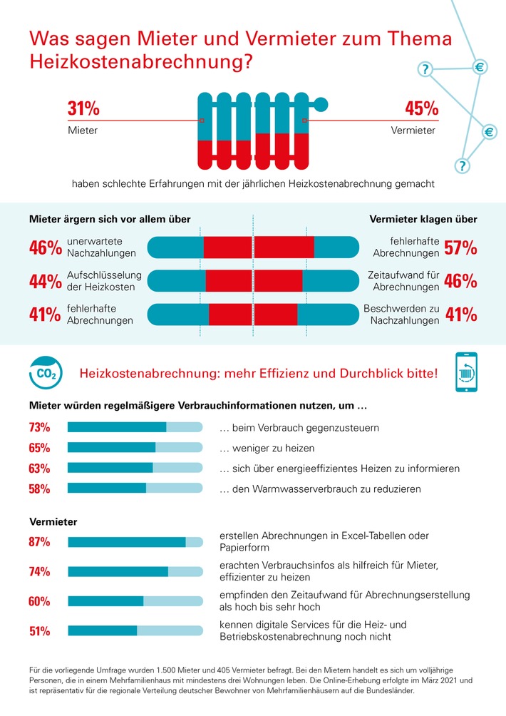 Für die vorliegende Umfrage wurden 1.500 Mieter und 405 Vermieter befragt. Bei den Mietern handelt es sich um volljährige Personen, die in einem Mehrfamilienhaus mit mindestens drei Wohnungen leben. Die Online-Erhebung erfolgte im März 2021 und ist repräsentativ für die regionale Verteilung deutscher Bewohner von Mehrfamilienhäusern auf die Bundesländer.