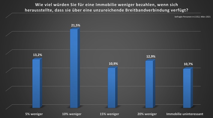 Köln (ots) – Lahmt das Internet, sinkt das Kaufinteresse. Auf diesen Nenner kann man die Ergebnisse einer aktuellen Umfrage des Eutelsat-Breitbanddienstleisters konnect mit über 2.000 Teilnehmern herunterbrechen. Jeder Zehnte würde vom Kauf absehen, wenn der Internetanschluss nicht den Erwartungen entspricht. Für mehr als ein Fünftel der Befragten reduziert sich der Immobilienwert um zehn Prozent, für ein Achtel sogar um 20 Prozent, wenn die Breitbandanbindung zu schlecht ist. In ländlich geprägten Regionen und den Randlagen der Metropolen verschärft sich die Situation. Laut Umfrage steigt in Städten mit 5.000 bis 50.000 Einwohnern der Anteil derer, die einen Wertverlust von 20 Prozent angeben, von einem Achtel auf 14 Prozent