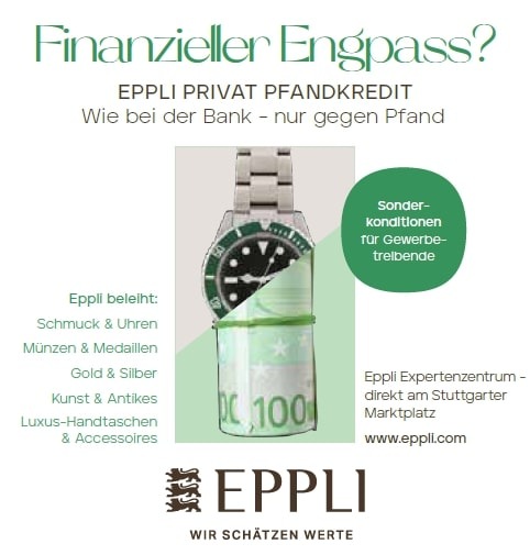 Eppli ist ein inhabergeführtes Traditionsunternehmen direkt am Stuttgarter Marktplatz. Deutschlands größtes Expertenzentrum bietet den Verkauf, die Beleihung, die Begutachtung oder die Versteigerung aller erdenklichen Werte an. Mit den obigen Sonderkonditionen und dem Verzicht auf übliche Margen setzt das Unternehmen ein Zeichen in dieser Pandemie und gibt dadurch gleichzeitig etwas an die Kaufkunden aus guten Zeiten zurück.