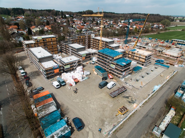 Nach dem Spatenstich im August 2020 waren auf dem ehemaligen Gewerbegelände zunächst die Abwasser-Grundleitung verlegt sowie die Kriechgänge, Bodenplatten und Sockelgeschosse der Gebäudekomplexe in Stahlbetonbauweise fertiggestellt worden. Im Januar dieses Jahres startete die Firma Huber und Sohn GmbH & Co. KG in Zusammenarbeit mit der Firma Grossmann Bau GmbH & Co. KG dann mit der Errichtung der Gebäudekomplexe in Holzhybrid-Systembauweise. Dabei werden die Außenwände und die tragenden Innenwände vorgefertigt geliefert und in kurzer Montagezeit vor Ort zusammengefügt. Für die Holzbetonverbunddecken kommen ebenfalls vorproduzierte Holzelemente zum Einsatz, die mit Ortbeton ausgegossen werden. Da die Holzelemente komplett mit Oberflächen und Fenstern geliefert werden, wird parallel zum Rohbau auch die Außenfassade erstellt. Einzig die Apartmenteingangstüren werden später eingebaut.