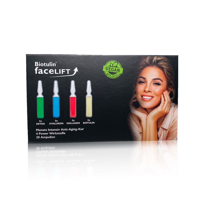 Aachen (ots) – Die Biotulin faceLIFT Seren sind eine hochkonzentrierte, vegane Intensivpflege fürs Gesicht. Durch die wässrige Konsistenz ziehen die Seren besonders schnell und tief in die Haut ein. Gleichzeitig sind die enthaltenen Pflegemoleküle besonders klein und können so noch besser aufgenommen werden. Die vier verschiedenen Seren sind optimal aufeinander abgestimmt. Das Ergebnis ist eine strahlende und frische Haut.
