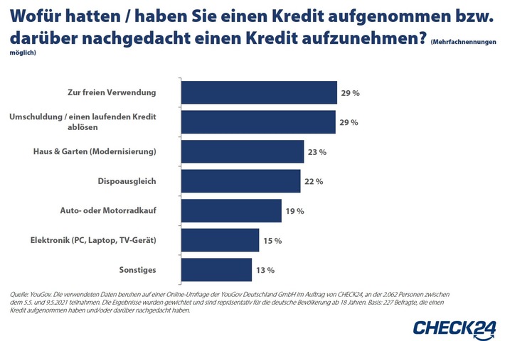 Am häufigsten möchten Verbraucher*innen das Geld von der Bank frei verwenden (29 Prozent) oder eine Umschuldung vornehmen, also einen laufenden Kredit ablösen (29 Prozent). Ein Kredit für die Modernisierung von Haus und Garten ist für 23 Prozent der Befragten relevant, ähnlich wie der Dispoausgleich (22 Prozent).3)