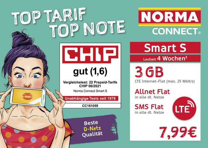 NORMA Connect „Smart S“-Tarif vom Technikmagazin CHIP mit Top-Note ausgezeichnet / 3 GB Datenvolumen und Allnet-Flat in alle deutschen Netze