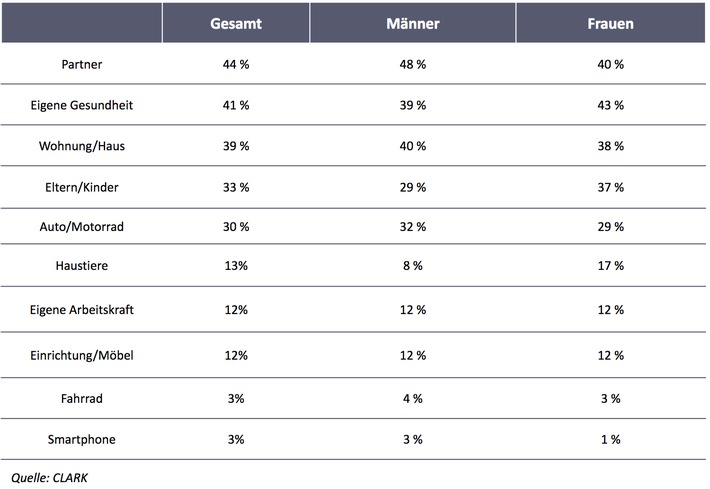 Gesundheit (41 Prozent) sowie Haus oder Wohnung (39 Prozent). Das ergibt eine