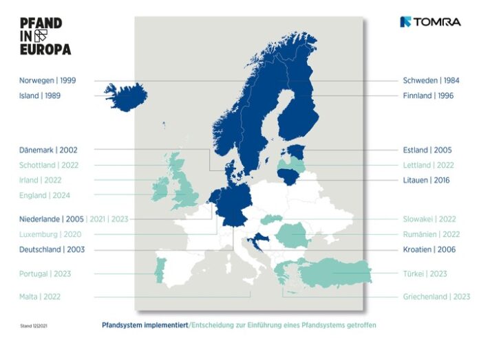Insgesamt liegt die Rücklaufquote von Einweggetränkepackungen nach Angaben der Deutschen Pfandsystem GmbH (DPG) bei 98 Prozent. Damit hat sie nicht nur für deutlich weniger Müll auf Straßen und in Wäldern gesorgt, sondern vor allem den Einstieg in die Kreislaufwirtschaft möglich gemacht: Über 40 Prozent der von den Automaten eingesammelten Einwegflaschen bestehen inzwischen aus Rezyklat. Der aufbereitete Kunststoff kann viele Male den Produktionsprozess durchlaufen und Rohöl ersetzen. Die EU fordert in der Richtlinie über Einwegverpackungen (SUP) bis 2025 als Einstieg nur 25 Prozent; Ziel ist das möglichst vollständige Schließen der Materialkreisläufe. Nun haben auch Lettland, die Slowakei, Rumänien, die Türkei, Griechenland, Malta, Portugal, Irland und Schottland beschlossen, im nächsten bzw. übernächsten Jahr ein Pfand auf Plastikverpackungen einzuführen (Karte).
