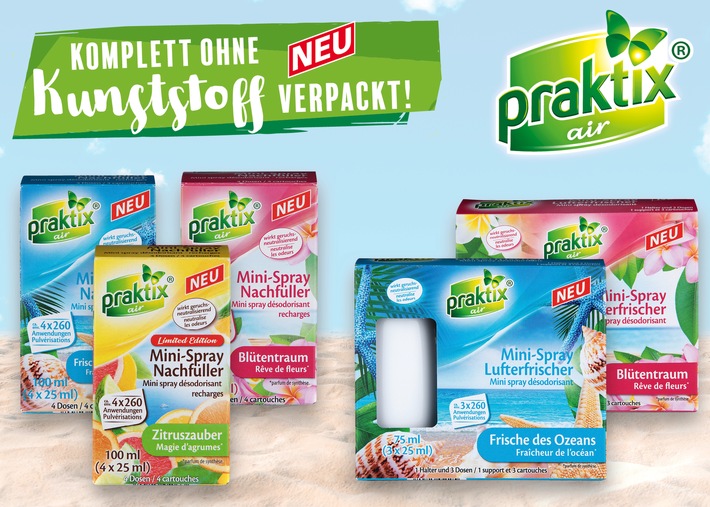 neuen PRAKTIX-Minisprays, deren Umverpackung jetzt völlig ohne Kunststoff