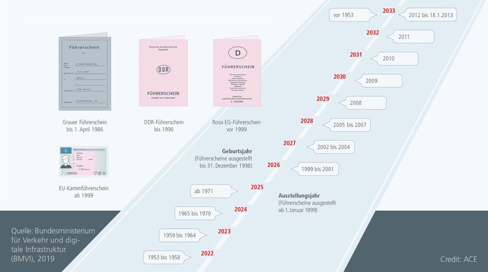 Bis 2033 müssen EU-weit insgesamt 42 Millionen Führerscheine umgetauscht werden. Mit dem neuen Checkkarten-Führerschein sollen alle Führerscheine in der EU einheitlich und fälschungssicherer werden. In Deutschland erfolgt der Umtausch gestaffelt nach Jahrgängen und nach Ausstellungsdatum. Wer zwischen 1953 und 1958 geboren wurde und einen Führerschein besitzt, der vor dem 1. Januar 1999 ausgestellt wurde, hat nur noch bis zum 19. Januar 2022 Zeit seinen Führerschein umzutauschen. Der ACE, Europas Mobilitätsbegleiter, erklärt, was beim Umtausch zu beachten ist.