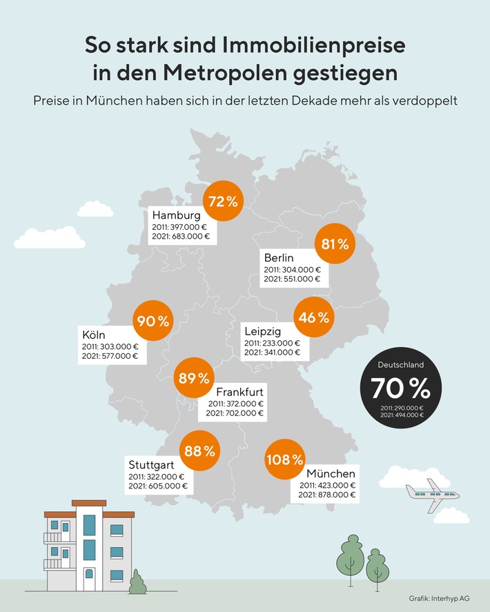 Der durchschnittliche Preis für eine finanzierte Immobilie inklusive Nebenkosten liegt laut Interhyp 2021 bei 494.000 Euro und damit 10,5 Prozent über den Vorjahreskosten. Bereits 2020 waren die Preise gegenüber 2019 um etwas mehr als zehn Prozent gestiegen. In den Vorjahren waren die Steigerungen jeweils einstellig. Insgesamt sind die Kosten für den Bau oder Kauf von 2011 bis 2021 um 70 Prozent gestiegen. Die Preisentwicklungen auf dem Immobilienmarkt führen zu Diskussionen um mögliche Risiken. Die Finanzaufsicht BaFin will Banken ab Februar 2023 wegen der stark gestiegenen Immobilienpreise anhalten, Immobiliendarlehen durch Kapitalpuffer besser abzusichern.