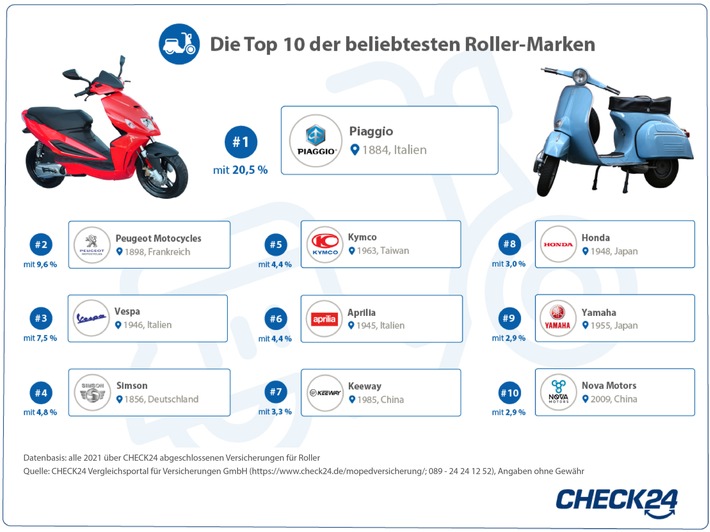 1)Datenbasis: alle 2021 über CHECK24 abgeschlossenen Versicherungen für Roller. Vespa und Aprilia sowie weitere Marken werden ebenfalls vom Unternehmen Piaggio produziert. Für diese Detailauswertung wurden die Marken jedoch separat betrachtet. Weitere Informationen und detaillierte Auswertung: https://www.check24.de/mopedversicherung/die-beliebtesten-rollermarken/