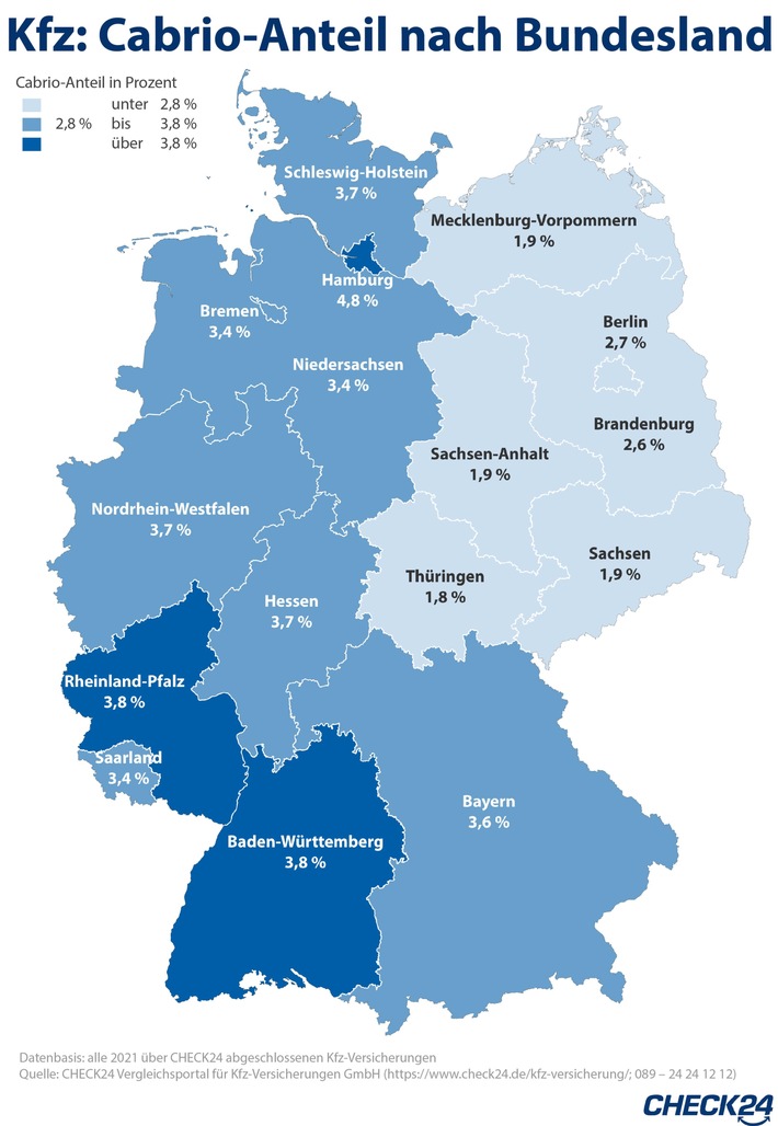 In Thüringen (1,8 Prozent), Mecklenburg-Vorpommern, Sachsen und Sachsen-Anhalt (je 1,9 Prozent) ist der Cabrio-Anteil an den versicherten Fahrzeugen am geringsten.