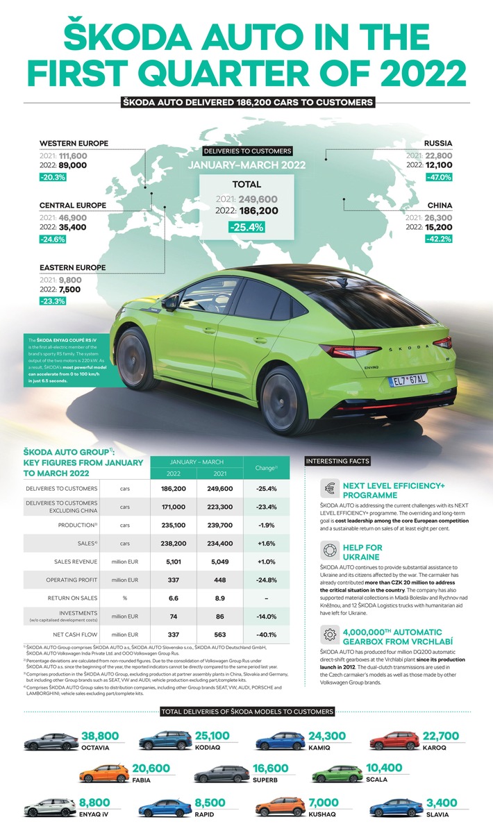 ŠKODA AUTO Group(1) – Kennzahlen im Quartalsvergleich, Januar bis März 2022/2021(2):