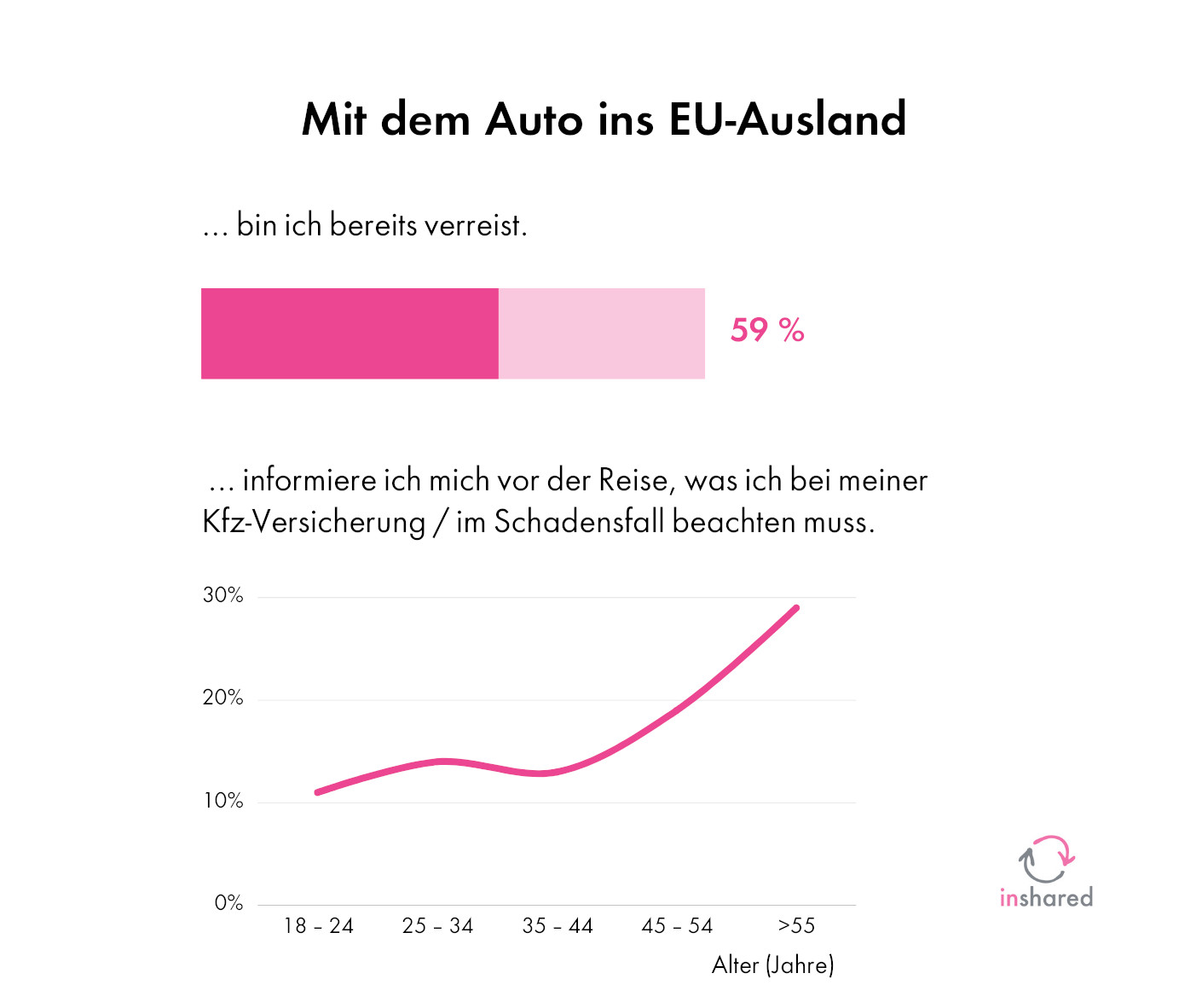Wen das Fernweh packt, dem bietet das Auto eine wunderbare Möglichkeit, Urlaubsziele spontan und unabhängig zu erkunden. Laut einer repräsentativen Umfrage* des Anbieters für Online-Versicherungen InShared, sieht das auch mehr als die Hälfte der Deutschen so: 59 Prozent der Befragten sind schon mit dem Auto ins EU-Ausland gereist. Bei lediglich 4 Prozent der Befragten kommt beim Gedanken, in den Pkw zu steigen, keine Reisestimmung auf: Sie gaben an, weder Erfahrung mit Auslandsreisen im Auto zu haben noch eine Reise in der Zukunft zu planen.