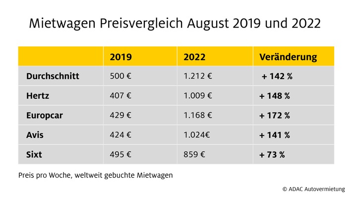 ADAC Autovermietung: Mietwagenpreise im August 2022 weiter auf hohem Niveau/ Mietwagen bleiben knapp und teuer/ Durchschnittliche Wochenmiete beträgt heute 712 Euro mehr als 2019 / Mietwagen Preisvergleich August 2019 und 2022 / Weiterer Text über ots und www.presseportal.de/nr/122834 / Die Verwendung dieses Bildes ist für redaktionelle Zwecke unter Beachtung ggf. genannter Nutzungsbedingungen honorarfrei. Veröffentlichung bitte mit Bildrechte-Hinweis.