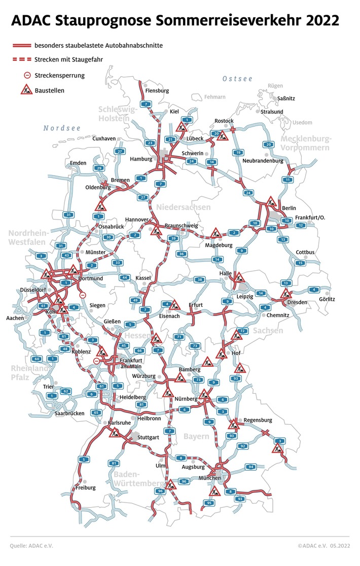 Staugefährdete Autobahnen im Sommerreiseverkehr 2022 / Weiterer Text über ots und www.presseportal.de/nr/7849 / Die Verwendung dieses Bildes ist für redaktionelle Zwecke unter Beachtung ggf. genannter Nutzungsbedingungen honorarfrei. Veröffentlichung bitte mit Bildrechte-Hinweis.