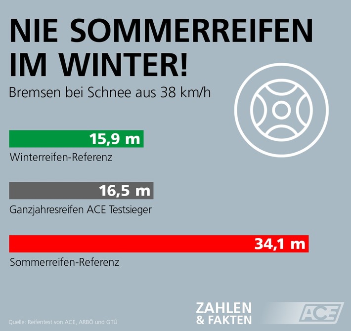 Berlin – Wer beim ersten Kälteeinbruch noch mit Sommerreifen unterwegs ist, kann Probleme bekommen. Deshalb empfiehlt der ACE, Europas Mobilitätsbegleiter, sich frühzeitig um die Winterbereifung zu kümmern.