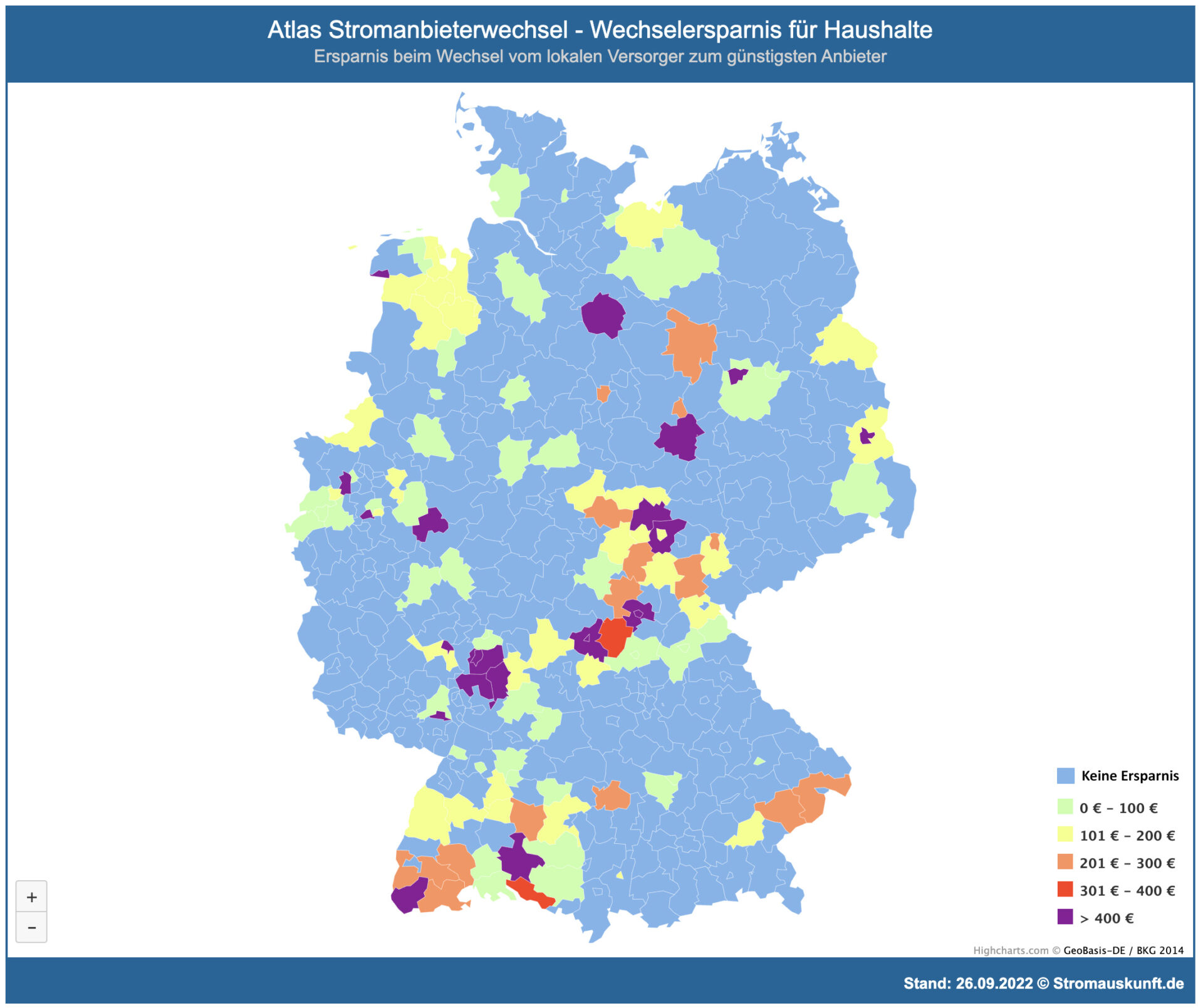 „Ein Blick auf unsere interaktive Karte zeigt, wo sich der Anbieterwechsel jetzt noch lohnt und wie viel Haushalte dort sparen können. Gleichzeitig wird auch deutlich sichtbar, dass in den meisten Regionen mittlerweile der Grundversorger der günstigste Anbieter ist“, sagt Dr. Jörg Heidjann, Energieexperte vom Vergleichsportal StromAuskunft.