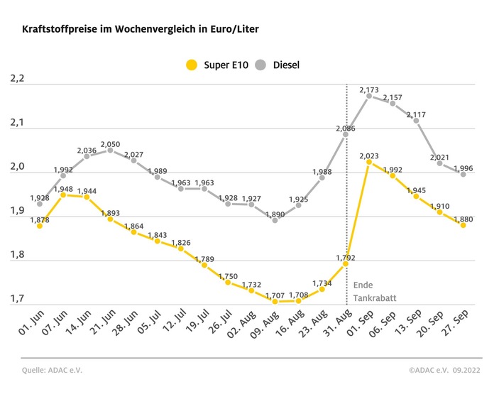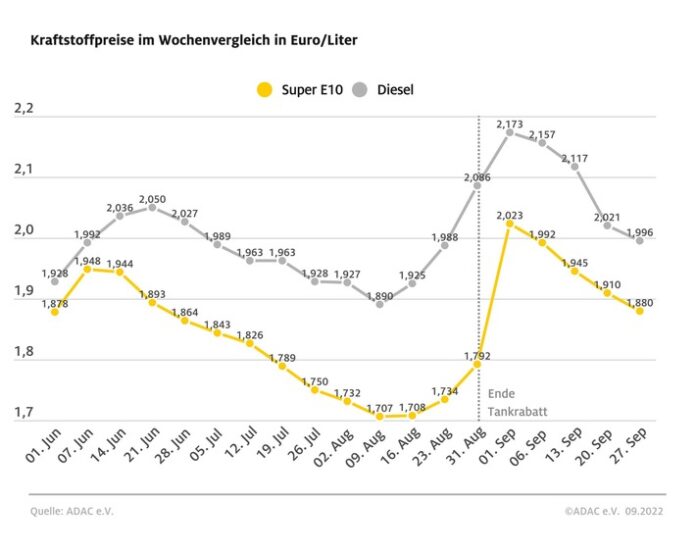 München – Erstmals seit fünf Wochen ist der Preis für Diesel-Kraftstoff wieder unter die Marke von zwei Euro gesunken. Wie die aktuelle ADAC Auswertung der Kraftstoffpreise in Deutschland zeigt, kostet ein Liter Diesel im bundesweiten Schnitt 1,996 Euro und damit 2,5 Cent weniger als vor einer Woche. Zuletzt lag der Diesel-Preis am 23. August mit 1,988 Euro je Liter unter der Zwei-Euro-Marke, damals aber noch unter den Bedingungen des Tankrabatts mit einem steuerlichen Abschlag von rund 17 Cent. Der Tankrabatt wurde planmäßig am 31. August beendet.